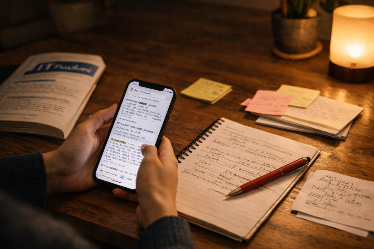 ITパスポートは短期集中型の試験ではありません。数週間から数か月かけて、少しずつ知識を整えていく資格です。だからこそ、日常に溶け込む形で設計することが鍵になります。疲れている日もあることを前提に、無理のない量を積み上げる。その姿勢が結果的に安定した継続につながります。