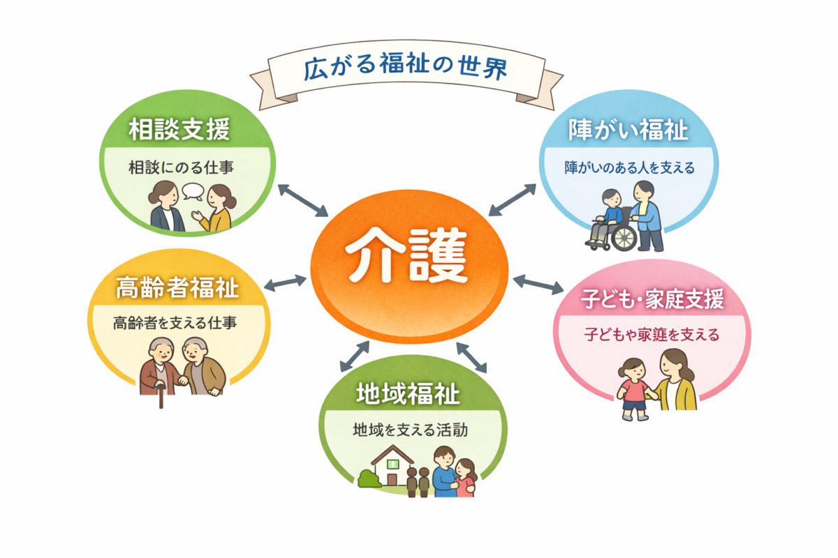 初任者研修を取得し、介護の現場を知り始めると、「この仕事は思っていたより広い」と感じる場面が出てきます。食事や入浴の介助だけでなく、家族とのやり取りや、地域とのつながり、制度の活用など、関わる範囲は想像以上に多いものです。ここで一度立ち止まり、介護を“福祉の一部”として見てみると、視野が少し広がります。